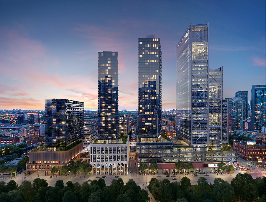 Spread over a four-acre site just north of two city landmarks, Rogers Centre and CN Tower, the development plans call for twin curved 58 and 48 storey office towers and apartments surrounded by newly landscaped public parkland, and 4.3 million square feet dedicated to new mixed-use office, residential, and retail spaces.